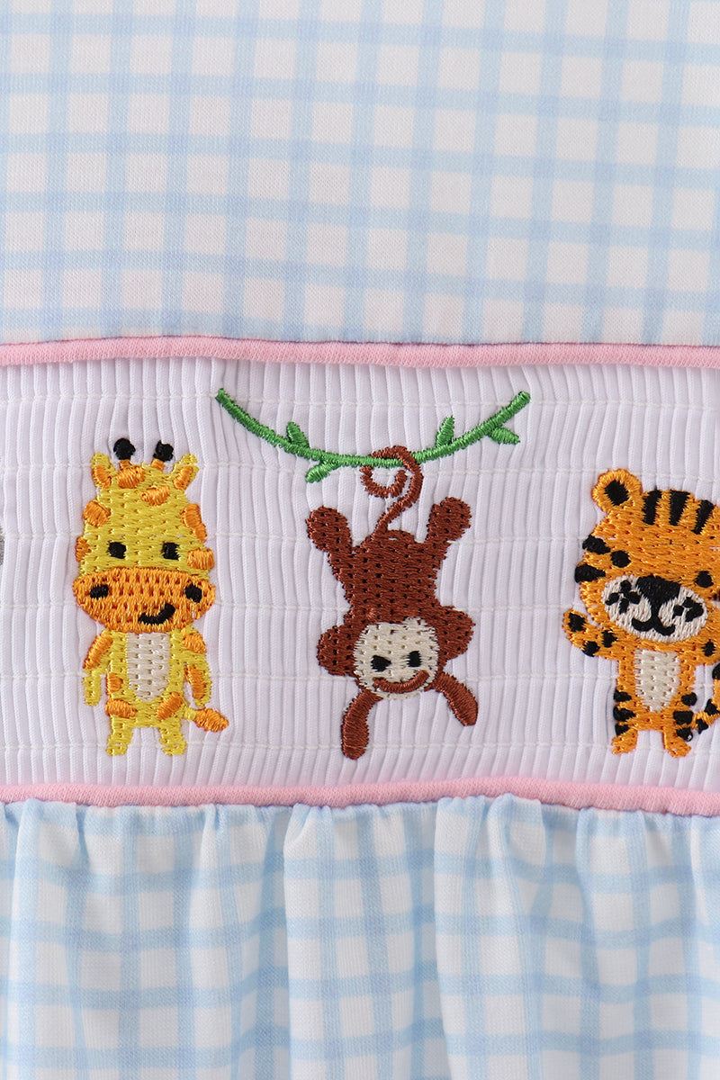 This blue romper features a fun animal print with charming smocked detailing and playful ruffle accents. Perfect for sunny days and outdoor adventures, its lightweight fabric ensures comfort while the cute design keeps your little one looking adorable and ready to explore.
