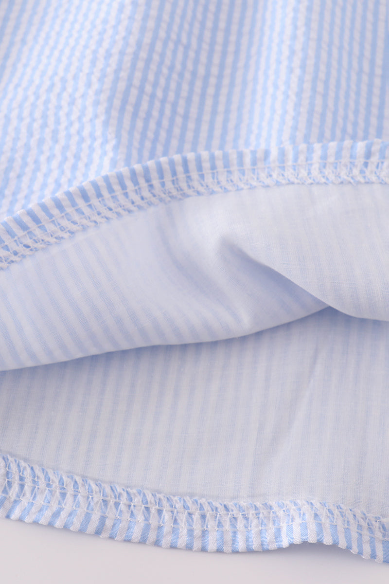 Get ready to stand out in this unique and fun blue seersucker dress with adorable crab embroidery and a smocked design. Perfect for any occasion, this dress is sure to turn heads and be the talk of the town. Who knew crabs could be so stylish?
