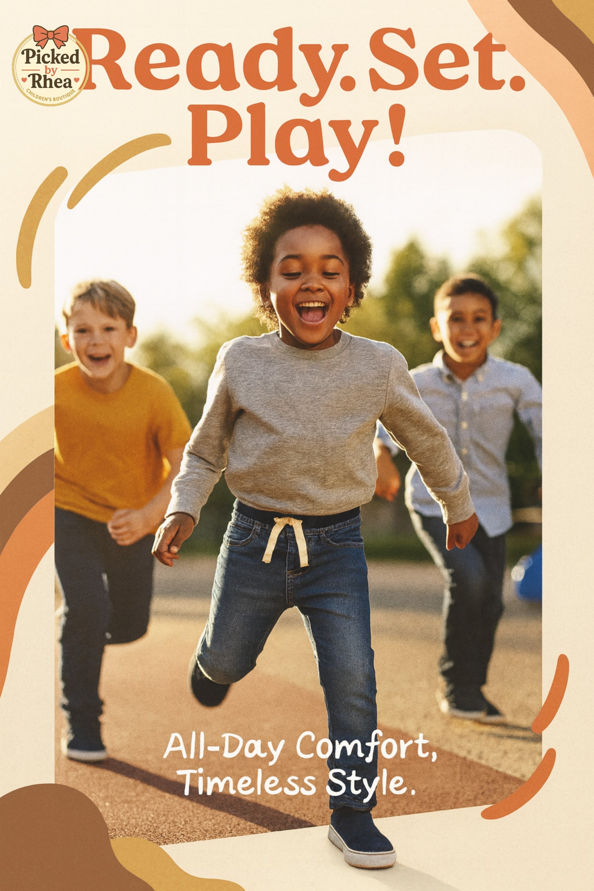 Handpicked with Love for school days, play dates, and everything in between. These easy pull-on jeans deliver the look of classic denim with the comfort of joggers. Soft, stretchy fabric moves with him; an adjustable elastic waist with functional drawcord keeps the fit just right. The versatile medium wash and clean, tapered leg dress up with a button-down or down with a tee—instant everyday favorite.