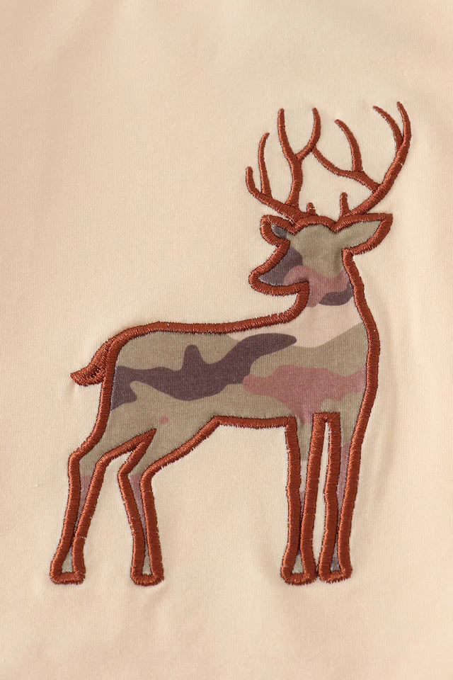 Handpicked with Love for little outdoor adventurers. This easy set pairs a soft sand short-sleeve tee with a stitched deer appliqué and comfy camo joggers featuring a drawstring waist and playful knee patches—mix, match, and play all day.
