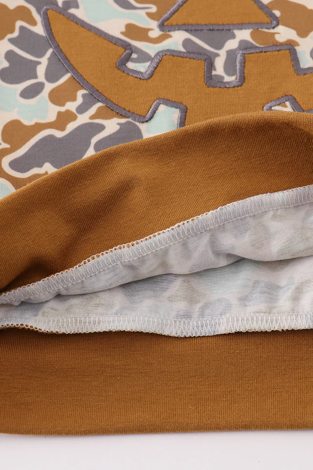 Details: soft knit/french-terry feel; crew neck; long sleeves; ribbed collar, cuffs, and hem in caramel; allover camo; jack-o’-lantern appliqué with contrast stitching; unlined.