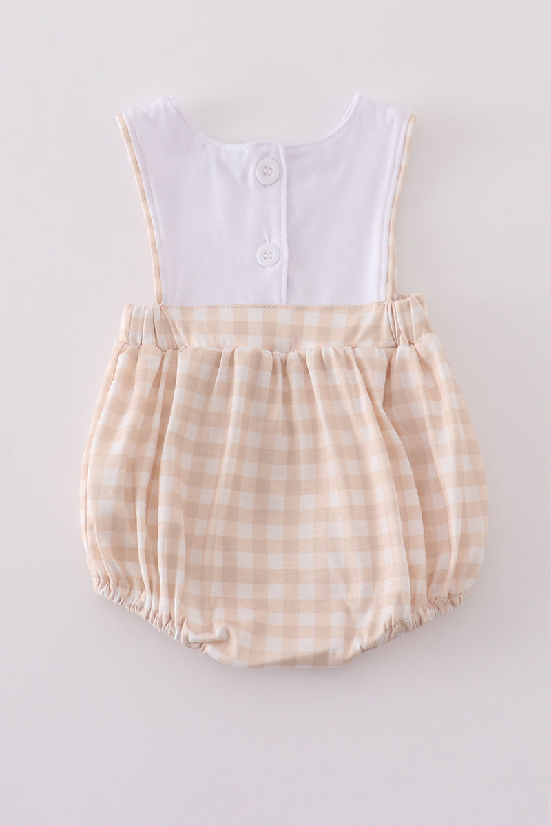Hop into Easter with this adorable cross-embroidered boy bubble! Perfect for any celebration, this outfit is sure to make a statement. (No pun intended!)