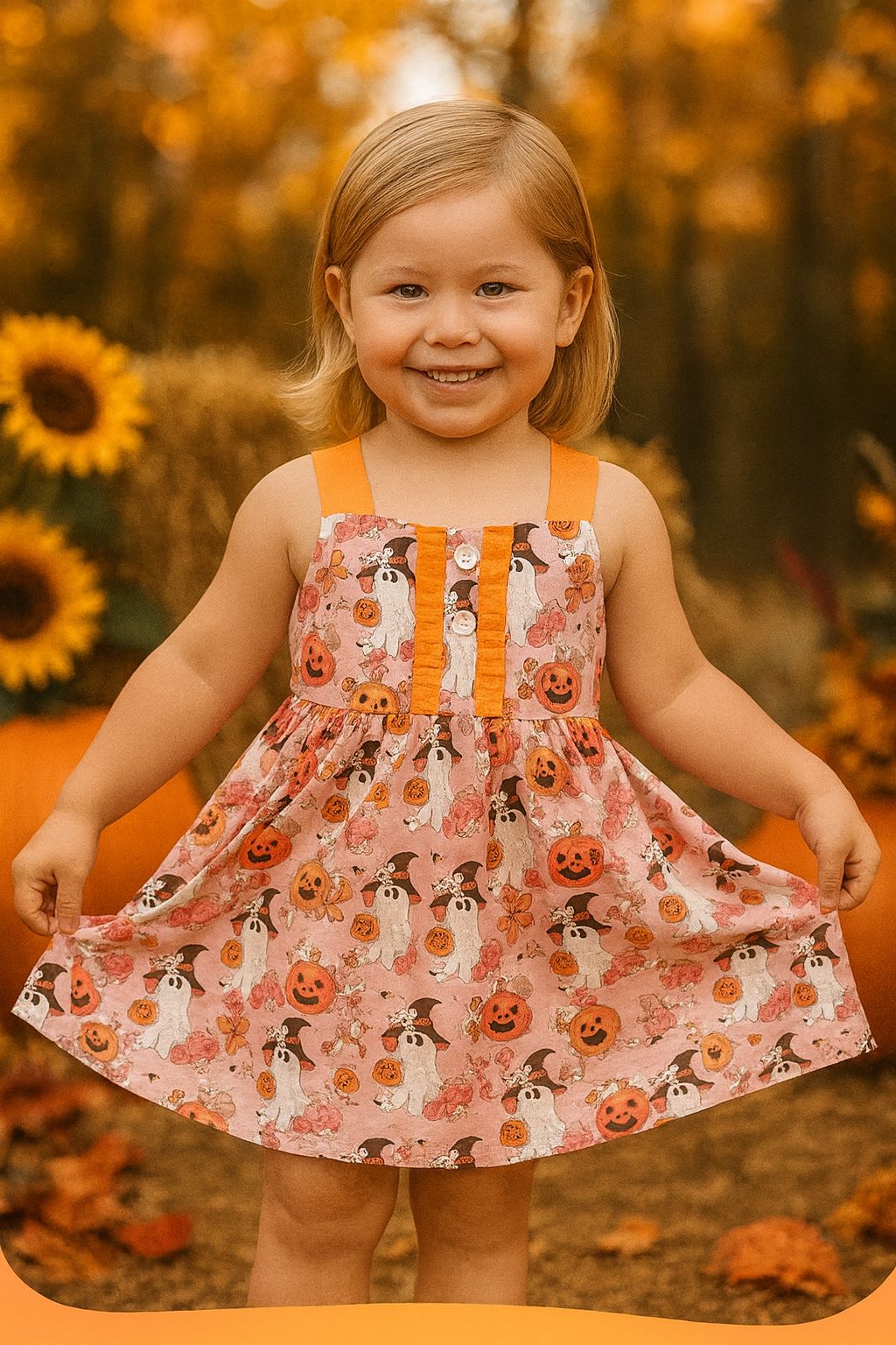 Handpicked with Love for pumpkin-patch photos, school parties, and every boo-tiful fall day. This twirl dress pairs a sweet pink print of friendly ghosts, jack-o’-lanterns, and daisies with candy-corn orange straps. A ruffled button placket gives boutique charm, while the soft, stretchy knit keeps her comfy for trick-or-treats and twirls galore. Easy to layer with tees or cardigans as the weather cools.