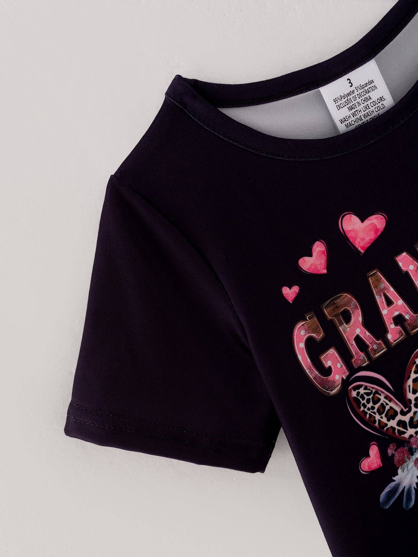 Top: black short-sleeve crewneck, “Grandma’s Girl” heart/bow graphic
