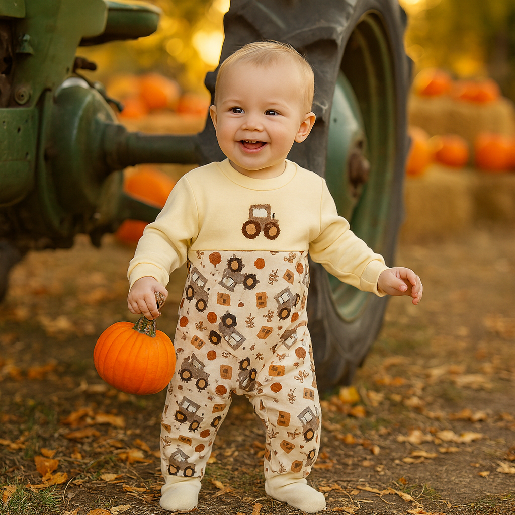 Handpicked with Love for pumpkin-patch days and tractor rides. This cozy one-piece pairs a butter-yellow knit top with a playful allover tractor & harvest print. A soft tractor appliqué adds charm, while gentle stretch and easy diaper-change access keep baby comfy from tummy time to nap time. Picture-ready for fall festivals, family photos, and every cuddly moment in between.