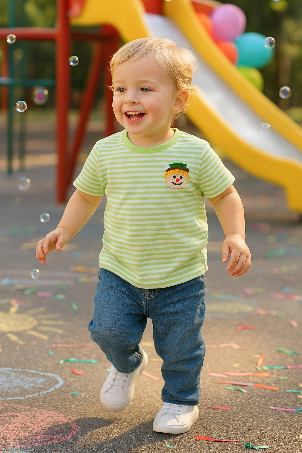 Details: soft stretch knit (approx. 95% polyester, 5% spandex); mint/ivory micro-stripes; embroidered scarecrow chest appliqué; mint contrast rib crew neck; short sleeves; straight hem; pull-on.