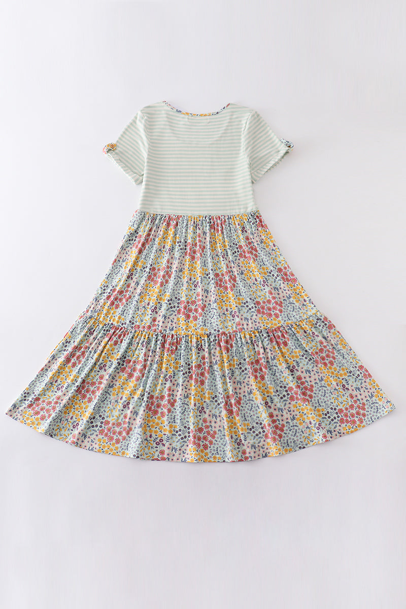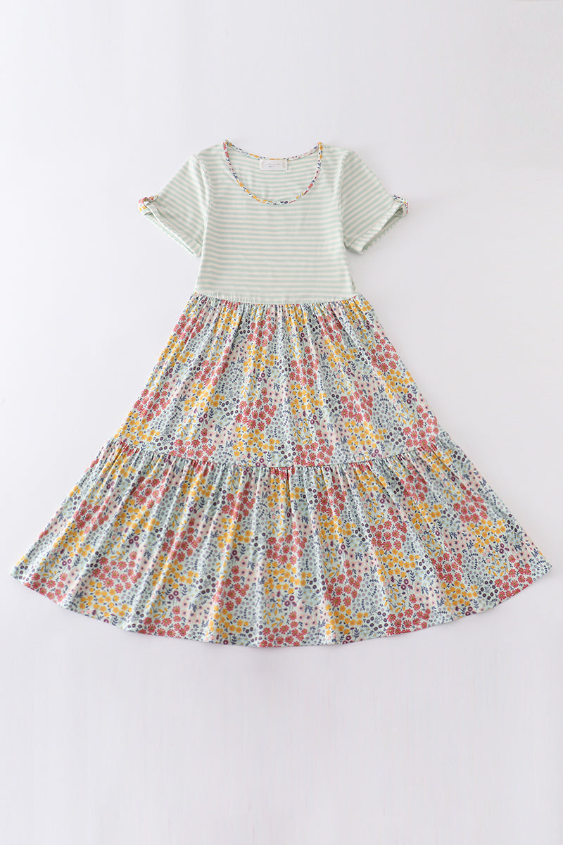 "Take a walk on the whimsical side with our Platinum floral print stripe tiered dress! Elegant and playful, this dress features a stunning floral print with a touch of edgy stripes. Perfect for any occasion, it's a must-have addition to your wardrobe. Get ready to turn heads with this unique and stylish dress!"