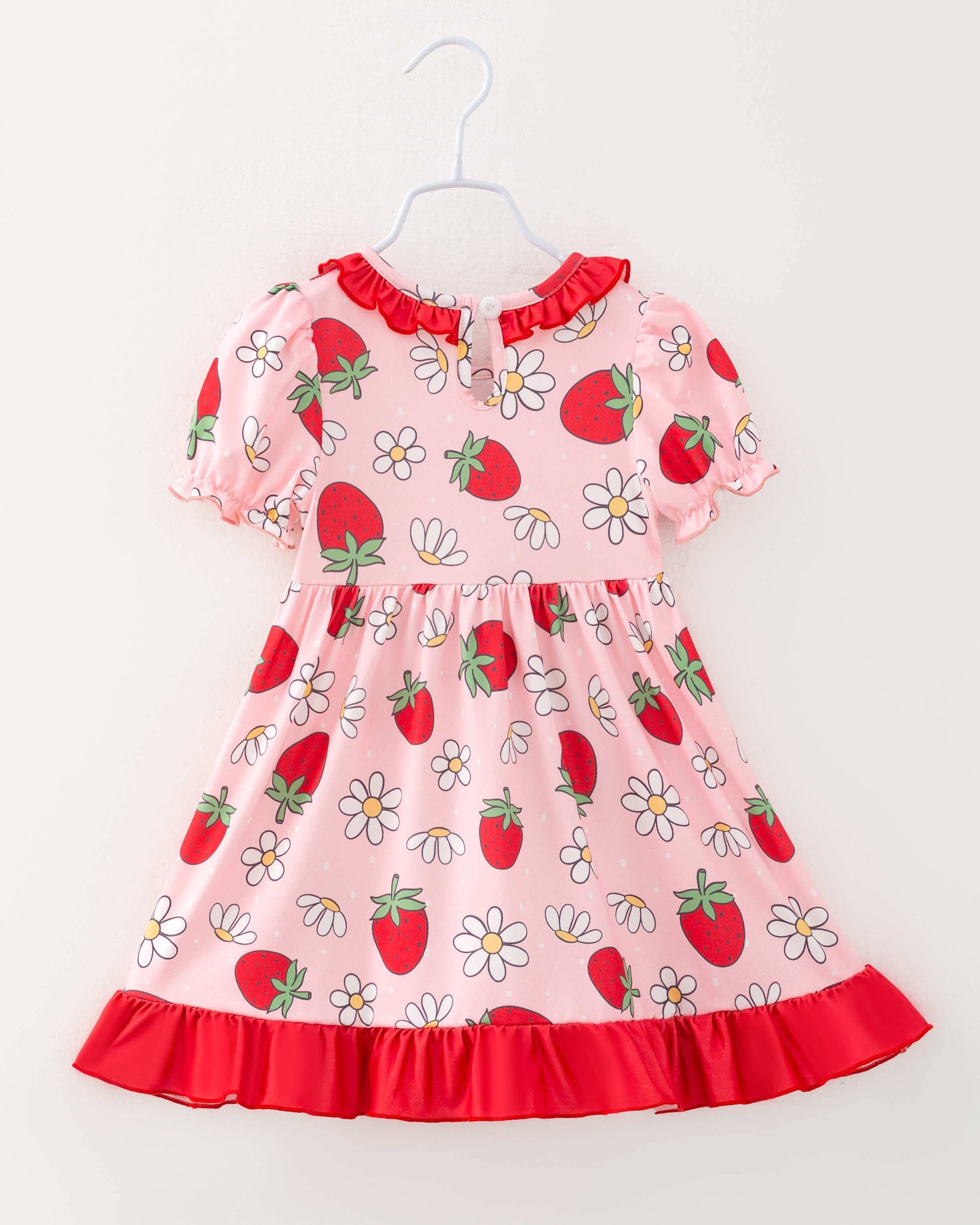 Details: soft knit; round neckline with contrast ruffle; short puff sleeves with gentle elastic; smocked/appliqué panel at chest with strawberry/daisy detail; allover strawberry–daisy print; gathered, twirl-ready skirt with contrast ruffle hem; back button/keyhole; unlined.